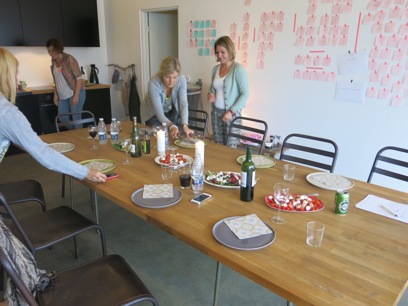 Po práci nás čekala společná večeře. Rozhodli jsme se nechodit nikam do města a vše si připravit přímo v showroomu v jídelně. Všimněte si zdi s lístečky – to vše jsou nápady, které tam postupně lepí všichni z firmy 🙂