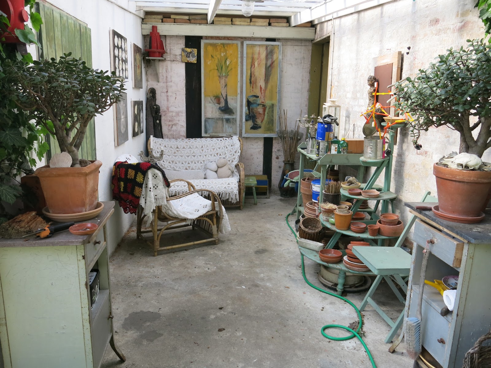 Na zahrádce má Stine tuto stylovou zastřešenou verandu…všimněte si hlavně žluto-červené sochy z kartáčků na zuby, kterou Stine opět ulovila od nějakého místního umělce:-)