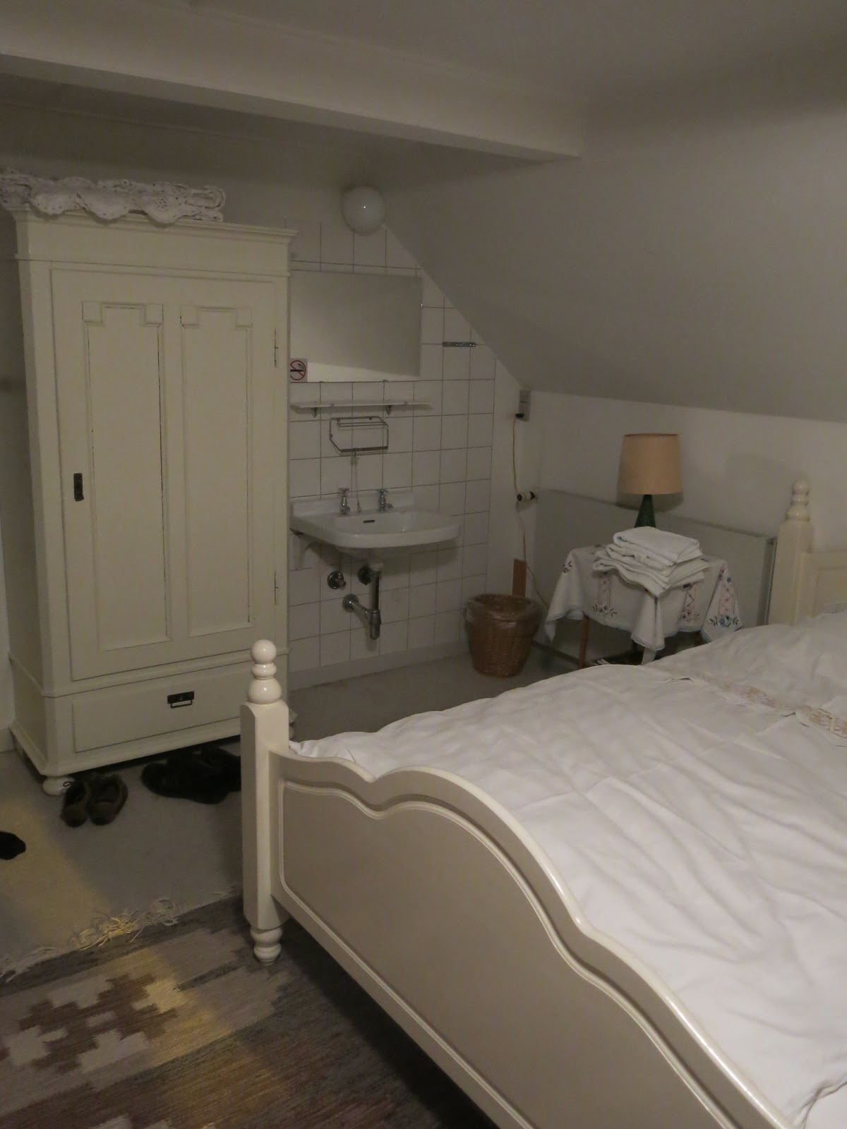 Nevěřila bych, že je vše koupené v antik obchůdcích a na bleším trhu. Vypadá to, jakoby to tu někdo zanechal v původním stavu po dlouhé roky. Na posteli je babičkovské povlečení s krajkou, na stolečku čerstvé květiny, které pro nás Stine natrhala v její zahrádce. Jak milé!