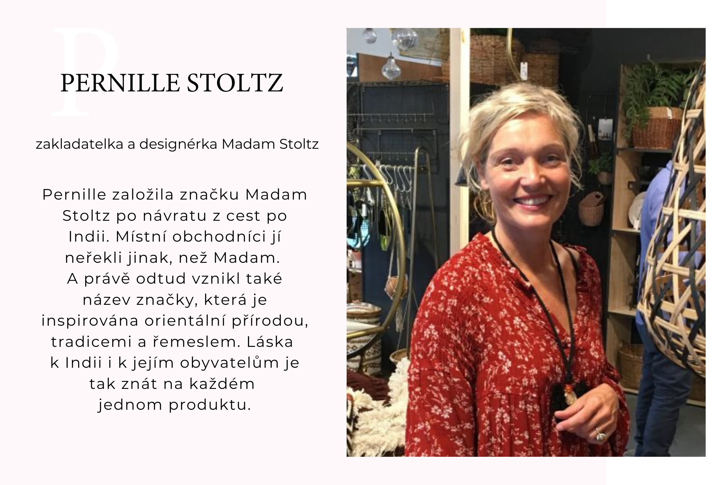 Má cesta začala před 30 lety v Indii. Abych si na cestování vydělala, začala jsem prodávat šperky. Tamní svět řemesla a barev se mi natolik vryl pod kůži, že jsem po návratu do Dánska otevřela svůj první butik. Z dobrodružné cesty se tak stal celoživotní příběh značky Madam Stoltz.